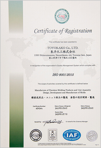 2013年3月8日に精密成形品・ユニット組立の製造・金型の設計開発・製造において、国際規格ISO9001(品質マネジメントシステム)の認証を取得いたしました。